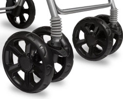 Les roues en EVA, durables, avec suspension souple sur les roues avant, absorbent les vibrations. Le blocage pour aller droit aide sur les pavés et les irrégularités.