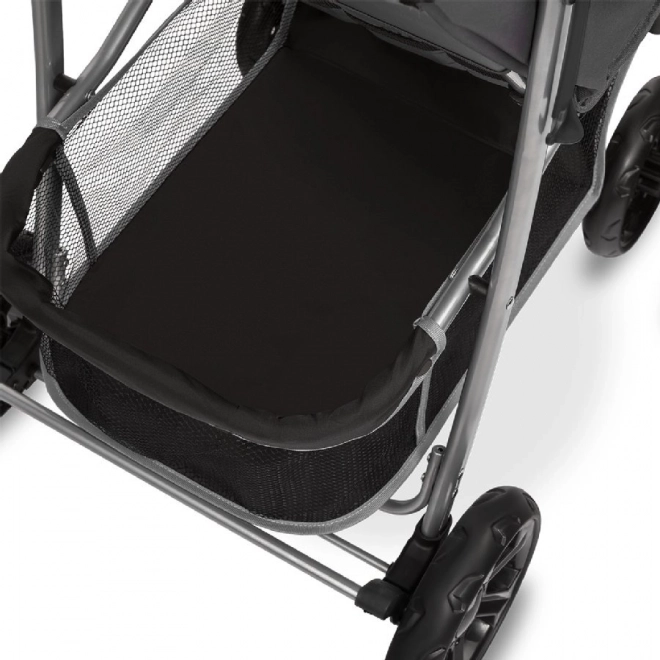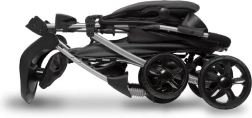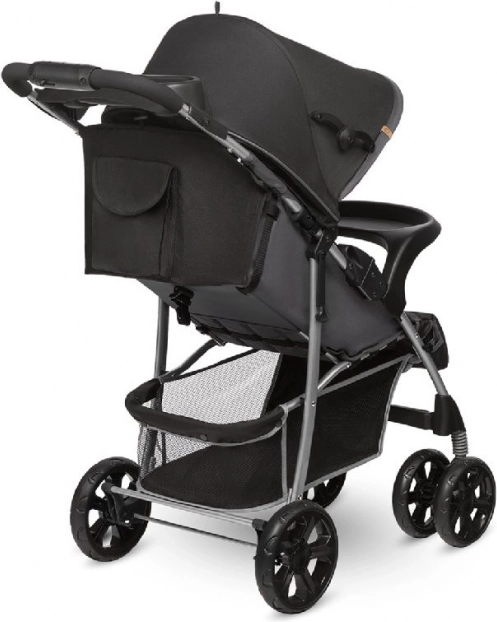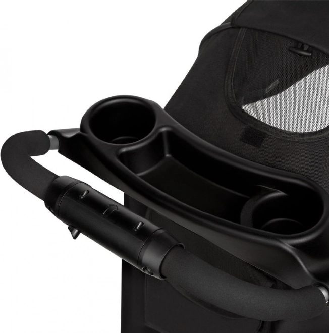 La poussette se plie facilement en dimensions compactes pour le transport ou le rangement dans le coffre. Pour le confort des parents, on trouve un organizer avec porte-gobelet près de la poignée et un sac pratique avec compartiments inclus.