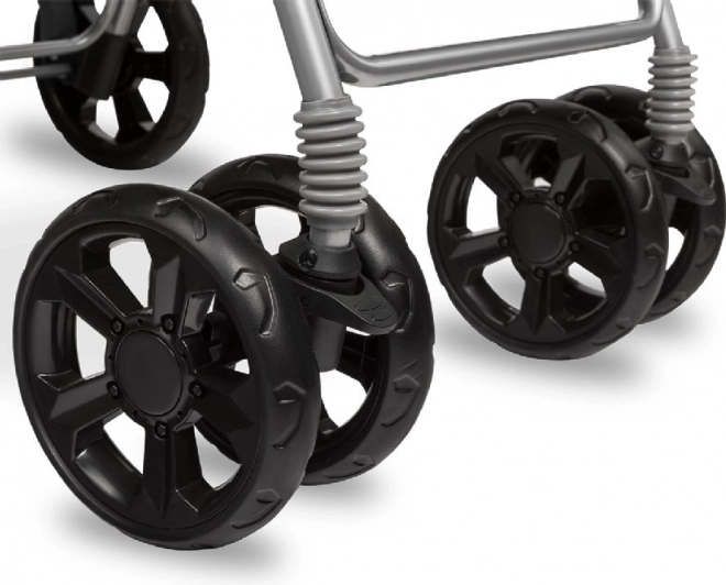 La sécurité est assurée par des harnais 5 points avec protège-épaules doux et une barre amovible avec plateau et porte-gobelet. La structure a été testée en laboratoire SGS et est conforme à la norme EN 1888. Les roues en mousse EVA avec suspension souple sur l’essieu avant garantissent une conduite fluide et une maniabilité aisée, avec la possibilité de bloquer la direction pour aller droit.