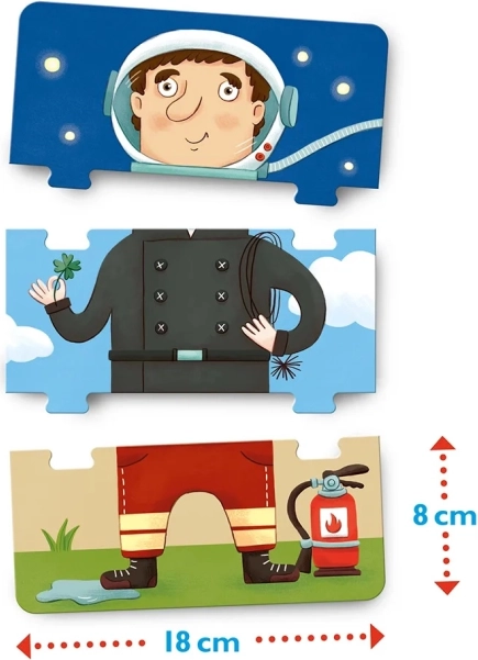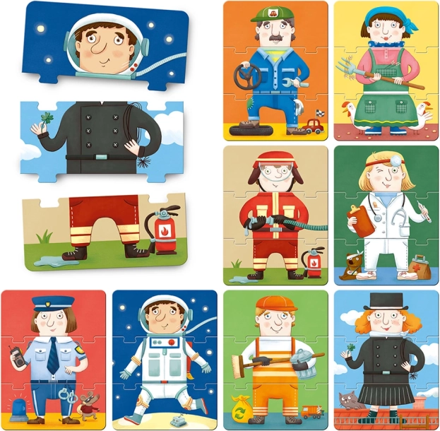 Découvrez le monde des professions de façon ludique ! Les puzzles en trois parties peuvent être combinés librement pour créer des personnages amusants – de l’astronaute au ramoneur. Les grandes pièces robustes sont faciles à saisir même pour les plus petits et stimulent leur créativité ainsi que leur raisonnement logique.