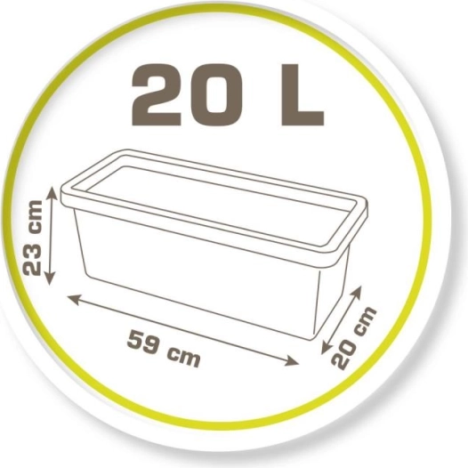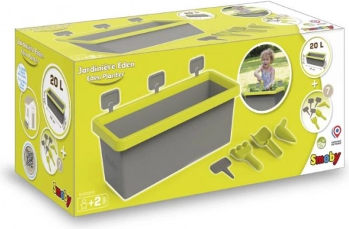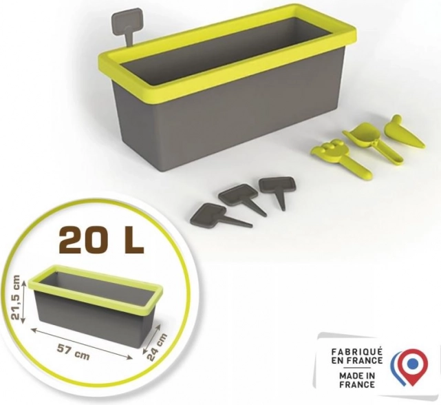 Jardinière pour fleurs ou légumes, capacité 20 litres. Comprend 4 étiquettes à piquer, un plantoir, un petit râteau et une petite pelle. Zone de rétention d’eau, fond pouvant être percé selon les besoins. Dimensions de la jardinière : 59 × 21,5 × 24 cm.
