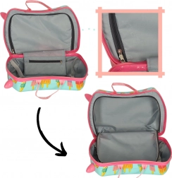 La conception spéciale permet à l’enfant de s’asseoir sur la valise ou de faire un petit trajet. Des repose-pieds intégrés et des poignées assurent confort et meilleure tenue.