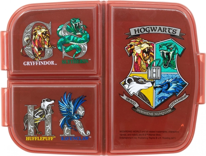 Pratique boîte à goûter pour enfants à trois compartiments avec motif HARRY POTTER qui garde les aliments séparés et frais. Fabriquée en plastique résistant, elle se glisse parfaitement dans le sac à dos scolaire et, grâce à sa fermeture sûre, elle est idéale pour les voyages, l’école et le terrain de jeu.