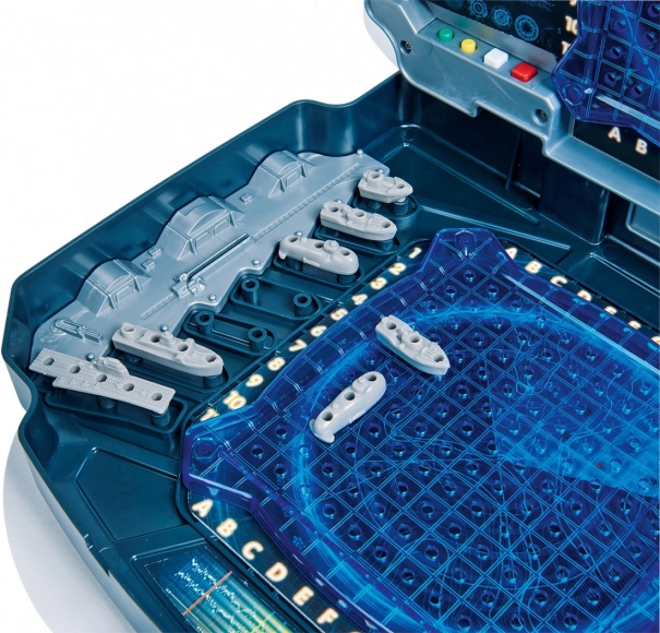 Après avoir dressé la cloison, chaque joueur place ses navires (invisibles pour l’autre joueur) sur n’importe quelles cases de son propre plateau. Les navires ne doivent pas se toucher directement. Le joueur dont c’est le tour annonce à l’adversaire des coordonnées, par exemple C3. L’adversaire vérifie si l’un de ses navires a été touché et appuie sur le bouton rouge pour indiquer un coup au but ou sur le bouton blanc pour indiquer l’eau; une explosion ou un bruit d’eau se fait entendre. Les lumières s’allument l’une après l’autre. Quand le projectile tombe à l’eau, les lumières s’éteignent. En cas de touche, les lumières clignotent en alternance. Le joueur qui a tiré marque sur son propre plan, placé sur la paroi de l’arme, la case correspondante, par exemple C3, avec un bouchon rouge en cas de touche ou un bouchon blanc en cas d’eau. L’adversaire marque le coup reçu sur son navire avec un bouchon rouge. Tant que le joueur touche, il peut continuer à tirer.