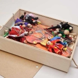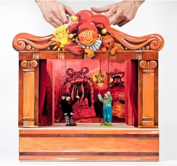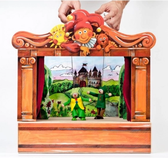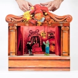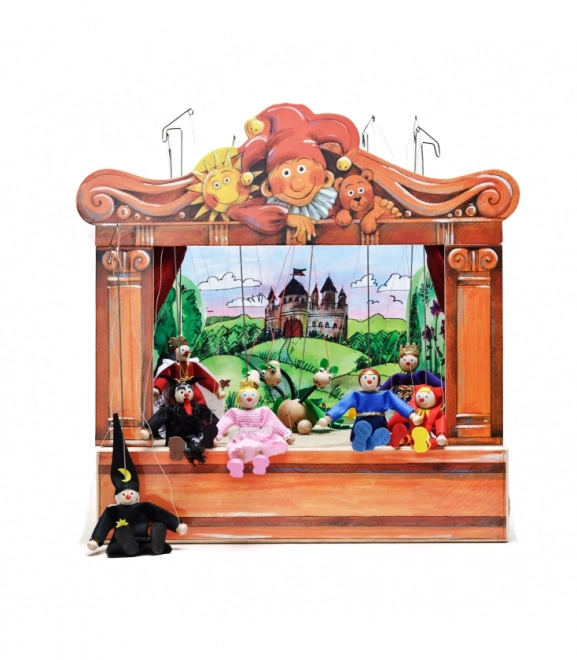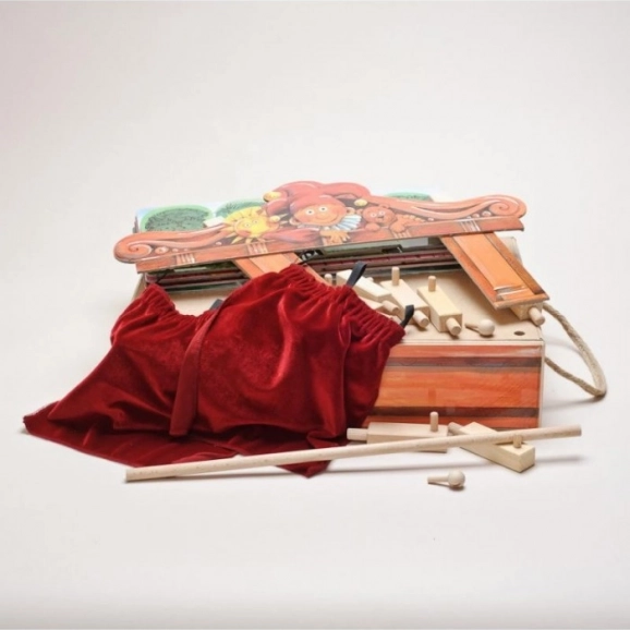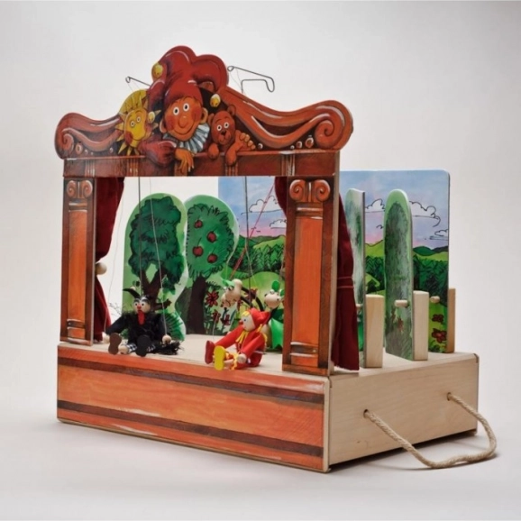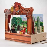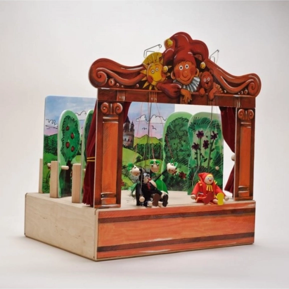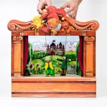 Théâtre en bois avec 2 décors réversibles et 8 marionnettes. Marionnettes fabriquées à la main avec possibilité d'extension avec d'autres marionnettes et décors.