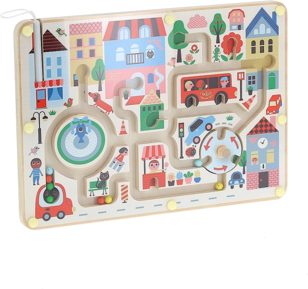 Entrez dans un monde plein de couleurs et de fantaisie avec le jeu Labyrinthe Magnétique Ma Ville. Utilisez le stylo magnétique pour guider les billes colorées à travers la ville et développez la motricité fine de votre enfant. Un jouet en bois qui n'est pas seulement un outil d'apprentissage ludique, mais aide aussi à enrichir le vocabulaire de l'enfant.