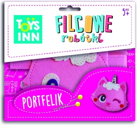Kit créatif de couture pour un porte-monnaie chat rose. Sécurisé pour les enfants, tout inclus, dimensions du produit fini 14×10×5,5 cm. Super cadeau pour les petits créateurs.