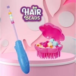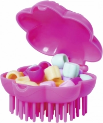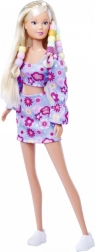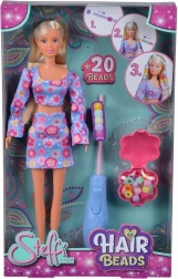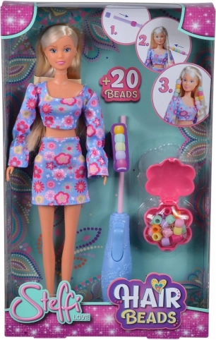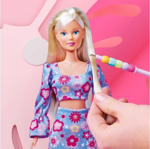 Poupée Steffi en tenue deux pièces à motif floral, avec un crochet pour enfiler des perles sur une mèche de cheveux, des perles colorées, un élastique pour la fixation et un peigne avec espace de rangement. Hauteur de la poupée : 29 cm.