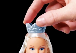 En tournant la couronne, les enfants choisissent le style : la robe fleurie rose romantique devient aussitôt une élégante robe de mariée blanche.