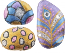 Le kit comprend 3 galets naturels, un pinceau, 5 pots de peinture, de la colle, des paillettes et des strass décoratifs – vous pouvez commencer à créer immédiatement.