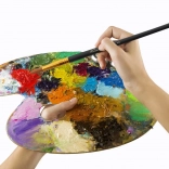 La palette en bois avec des couleurs vives ajoute une sensation authentique au processus artistique.