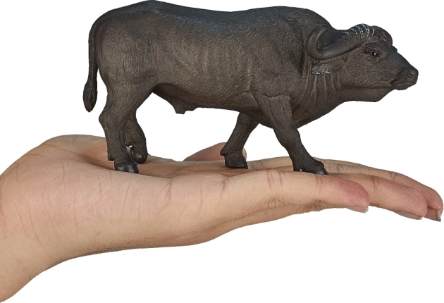 La figurine offre une finition réaliste et détaillée de la surface, imitant fidèlement la texture de la peau et la forme des cornes du buffle.