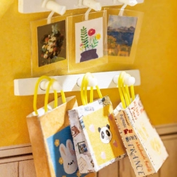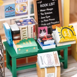 Étagères de livres, ourson adorable, fleurs et accessoires – chaque détail contribue à l’aspect réaliste et enchanteur de la mini-librairie.