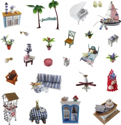 Le set comprend des pièces miniatures de mobilier et de décoration – du hamac et du piano aux fleurs et petites lampes. Tout pour un intérieur réaliste et chaleureux.