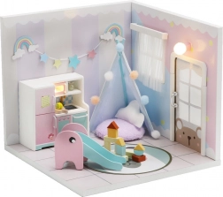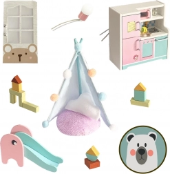 Assemblez votre propre chambre d’enfant avec une mini‑cuisine, un toboggan et des blocs. Cette miniature est idéale pour stimuler l’imagination et la pensée créative des enfants.