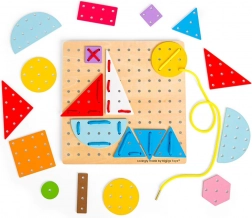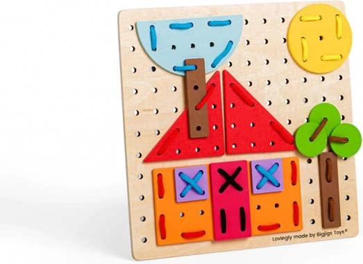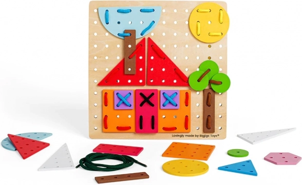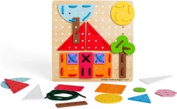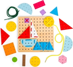 Ce jeu de laçage didactique est idéal pour les premières créations. Les enfants apprennent de façon ludique à reconnaître les couleurs et les formes, entraînent leur patience et la motricité fine des doigts. Grâce à la planche en bois perforée et aux pièces colorées, on crée des images simples ou plus complexes — exactement selon l’imagination des petits créateurs.