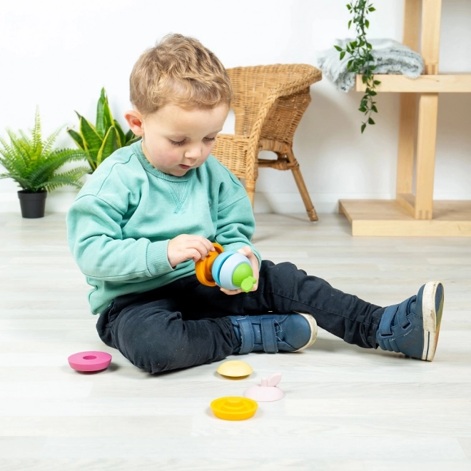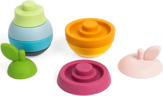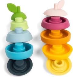 Un ensemble coloré de deux puzzles fruités qui réunit une tour à empiler et un anneau de dentition en un seul jouet. Chaque fruit est composé de 5 pièces en silicone 100 % sans plastique, que les enfants assemblent pour former une pomme et une poire. Favorise la motricité fine, la coordination œil–main et la perception des couleurs, facile à nettoyer et compatible lave-vaisselle. Convient dès 1 an.