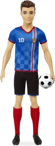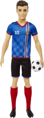 - Ken porte un maillot bleu à rayure, avec le numéro 10 et un écusson d’équipe, assorti d’un short noir, de crampons et de hautes chaussettes rouges.