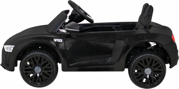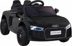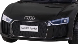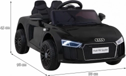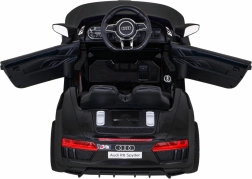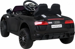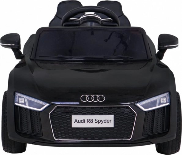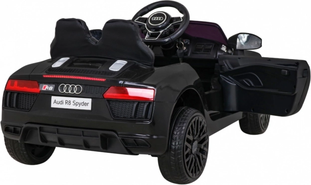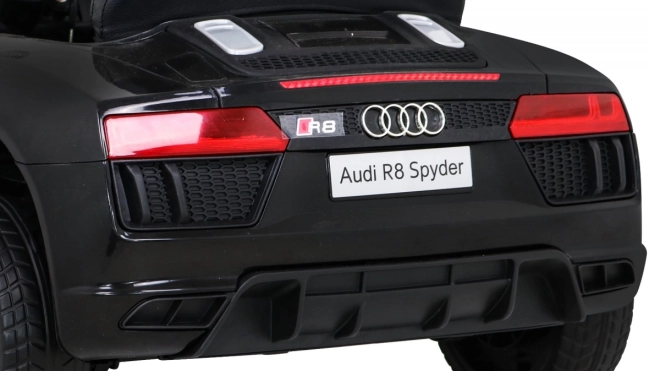Petit conducteur, grand bonheur. La voiture électrique AUDI R8 Spyder en élégant noir offre l’allure d’une véritable sportive, une prise en main simple et un fonctionnement sûr. Grâce à ses deux moteurs de 35 W et à son démarrage progressif, la conduite est confortable et stable, tandis que la suspension avant et arrière absorbe les irrégularités.
