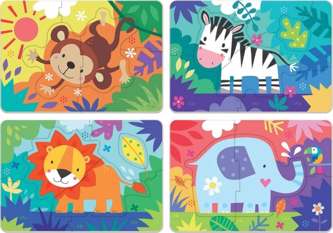 Le set comprend quatre puzzles individuels avec des motifs d'animaux – singe, zèbre, lion et éléphant. En plus de composer des images complètes, les enfants peuvent également retirer et assembler chaque animal individuellement. Les dimensions du puzzle terminé sont d'environ 24 x 16 cm.