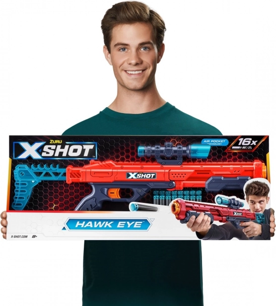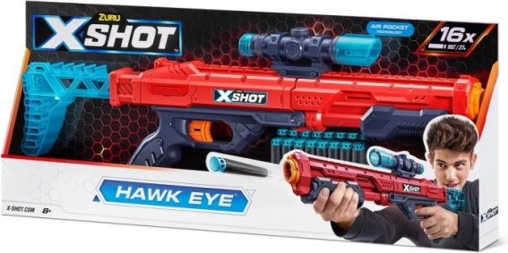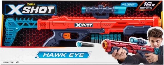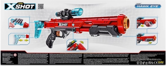 Améliorez votre précision avec le Zuru X-Shot Hawk Eye pour des tirs parfaits jusqu’à 27 mètres, avec une lunette amovible et un chargeur additionnel de 16 fléchettes.