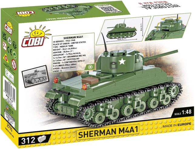 Découvrez l’emblématique char moyen américain M4A1 SHERMAN sous forme de kit de construction COBI à l’échelle 1:48. Le modèle propose une tourelle rotative, un canon mobile et une chenille fonctionnelle. Les pièces avec des impressions durables ne s’usent pas et sont compatibles avec d’autres kits. Idéal pour les passionnés d’histoire, les débutants et les collectionneurs.
