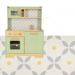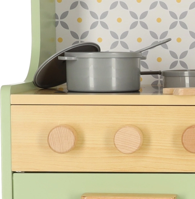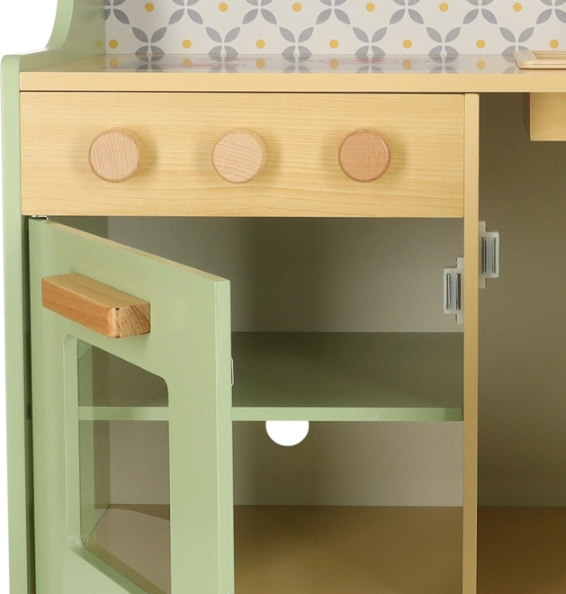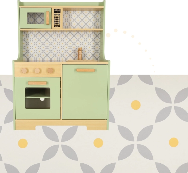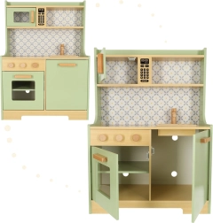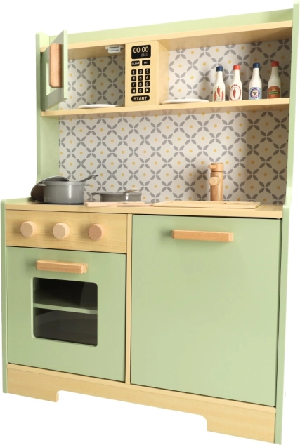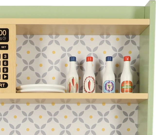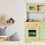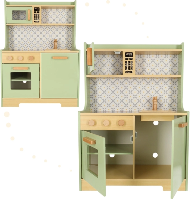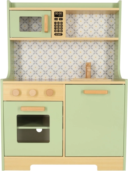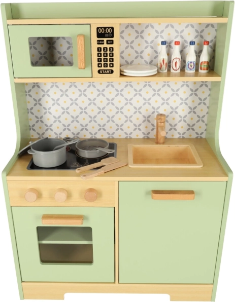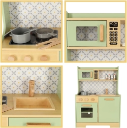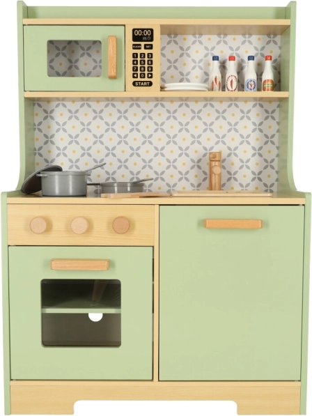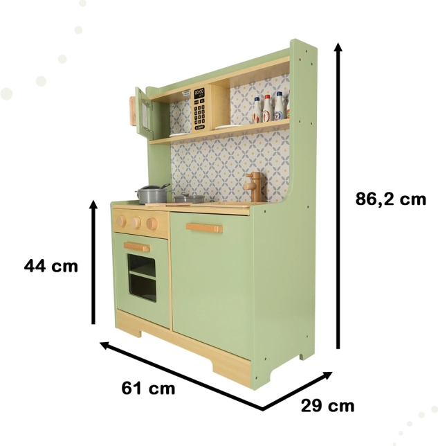 Laissez les enfants imiter leurs parents dans un environnement sûr avec la cuisine en bois vert menthe. Elle contient tous les éléments essentiels comme un four, un micro-ondes, une cuisinière mobile et un évier qui émettent des sons réalistes pour rendre la simulation de cuisine aussi crédible que possible.