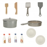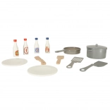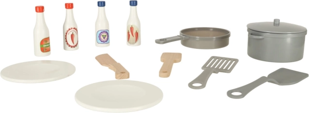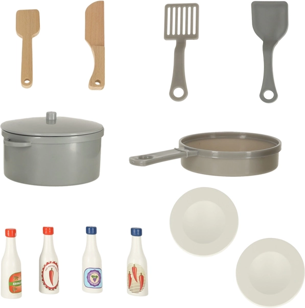 L'ensemble comprend un riche ensemble d'accessoires, qui inclut une poêle en plastique, une casserole avec couvercle, des ustensiles en bois et des assiettes. Pour parfaire les plats, il ne manque que quatre types différents de sauces.