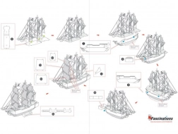 La maquette s’assemble sans colle – les pièces se connectent via des verrous et des languettes pliées. Pour un travail plus confortable, nous recommandons de petites pinces et une pince coupante (non incluses). Grâce à la gravure laser précise, tous les contours et détails ressortent, faisant de ce modèle une véritable pièce de collection.