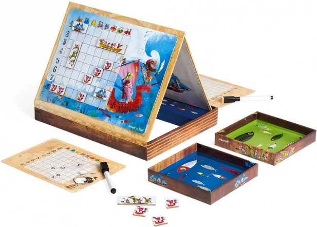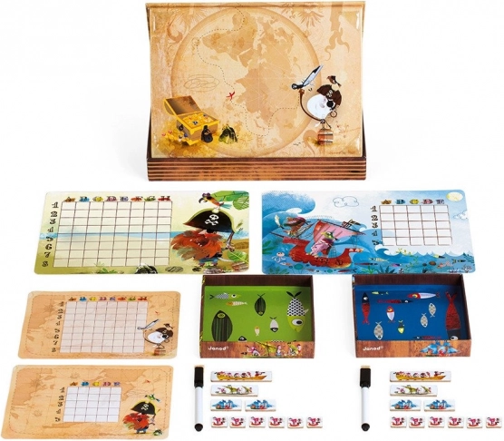 Découvrez un jeu stratégique palpitant pour enfants et adultes – le jeu magnétique de bateaux pirates de JANOD. Ce jeu développe la motricité fine, la pensée logique et la stratégie. Le coffret comprend 2 grilles de jeu pour différents niveaux, 20 petits bateaux magnétiques et 2 feutres effaçables. Jeu de société idéal pour les enfants dès 5 ans.
