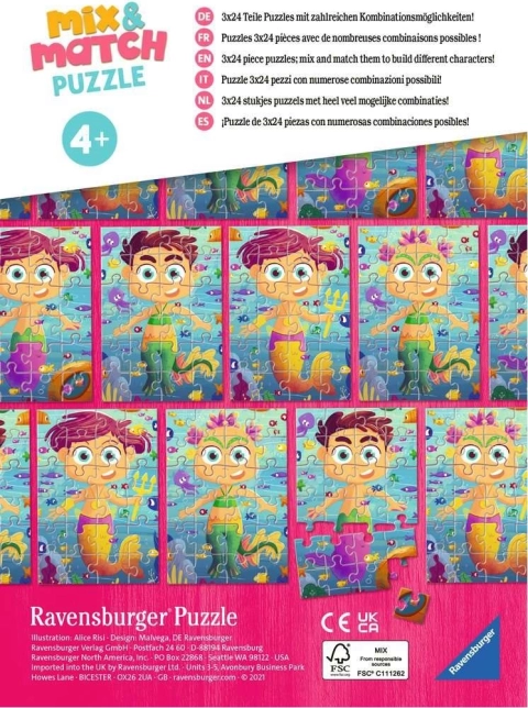 Nous vous présentons un ensemble de trois puzzles amusants avec des motifs de sirènes et de monstres marins. Chaque puzzle est composé de 24 pièces que vous pouvez soit assembler selon le modèle, soit combiner pour créer des personnages entièrement nouveaux et drôles. Ce jouet créatif stimule l’imagination et la motricité fine de vos enfants.