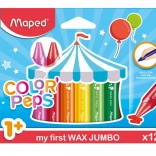 Crayons de cire sûrs pour enfants dès 1 an, set de 12 couleurs. Forme triangulaire JUMBO Ø 13 mm pour une prise en main correcte, gaine en papier anti-salissures, couleurs intenses et tracé doux, non toxiques.