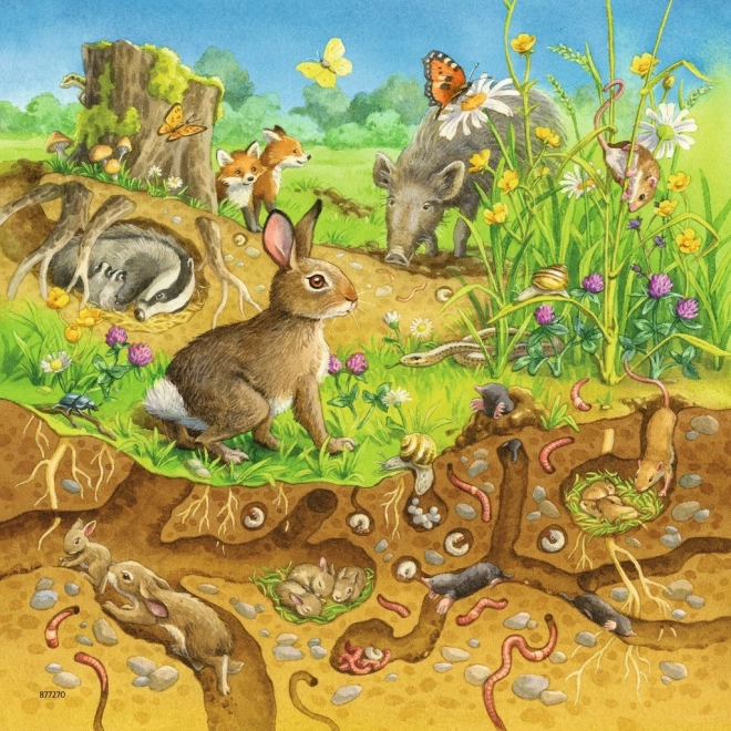 Illustration d’un lapin, d’un renard, d’un sanglier et de papillons à la surface, tandis qu’une taupe et des lapins occupent des refuges souterrains.
