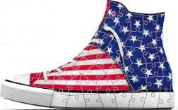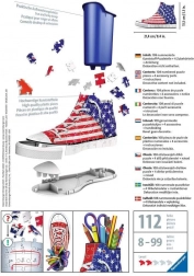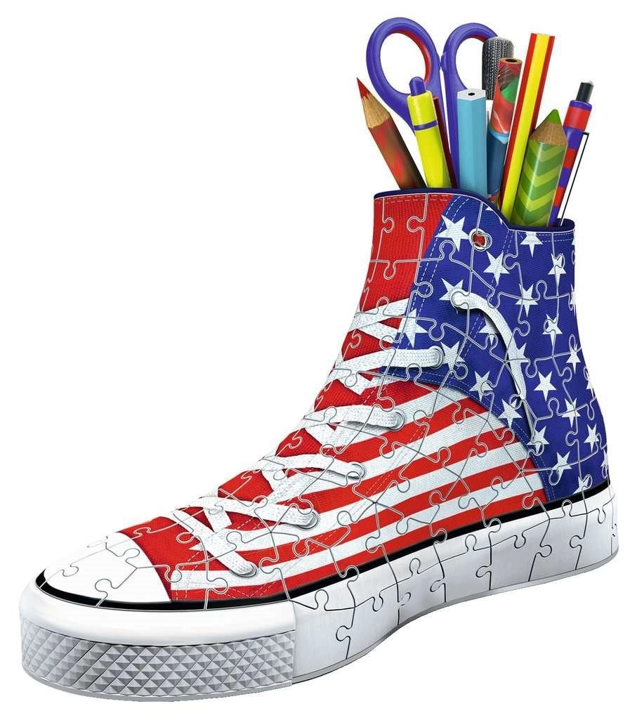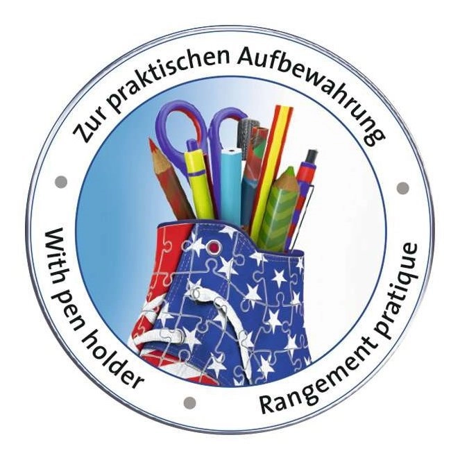 Association géniale pour les amoureux de sneakers et de puzzles ! Assemblez un puzzle 3D à la forme originale qui dynamisera votre bureau… RAVENSBURGER propose des baskets 3D qui peuvent servir d’originaux pots à crayons pour stylos, crayons ou pinceaux. Des pièces spéciales, courbées ou flexibles, qui s’emboîtent avec précision, permettent de construire une basket design avec un motif du drapeau américain, au rendu très réaliste. Les pièces sont en plastique rigide pour une excellente stabilité. La basket tient sans colle. Contenu de la boîte : 108 pièces de puzzle numérotées, 4 éléments d’accessoires et une notice. Le contenu de la basket montré sur la photo ne fait pas partie de l’emballage. Dimensions du puzzle assemblé : environ 21,4 × 13,5 cm
