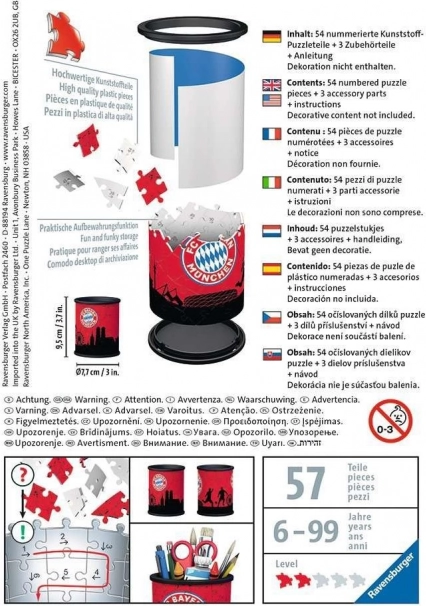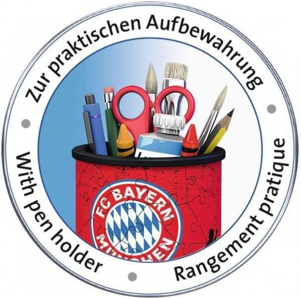 La marque appréciée RAVENSBURGER propose un pot 3D design avec le motif du club FC Bayern Munich. Les pièces spécialement façonnées et numérotées en plastique rigide s’emboîtent avec précision pour créer un organiseur stable qui fera plaisir au quotidien. Vous pouvez assembler soit en suivant le motif, soit les numéros indiqués au dos pour un montage facilité.