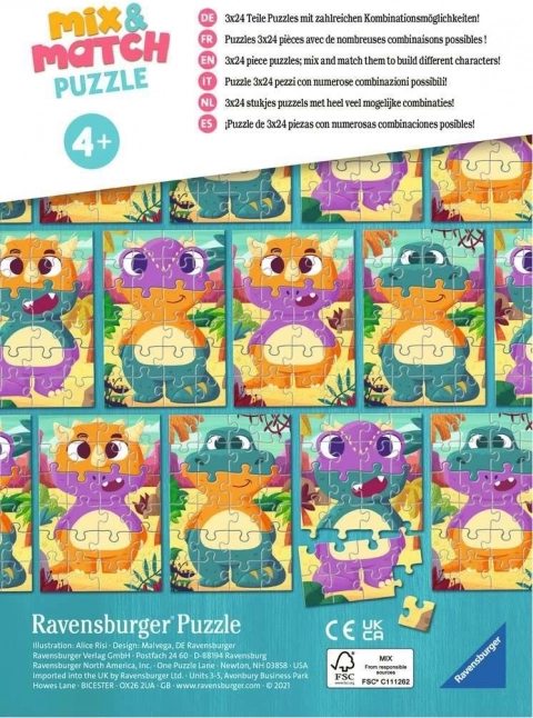 Ce set de trois puzzles pour enfants de la marque RAVENSBURGER propose le concept créatif Mix & Match. Chaque motif peut être assemblé classiquement selon le modèle, ou les enfants peuvent intervertir librement les pièces des différentes images pour créer des combinaisons originales et drôles de dinosaures adorables. Un excellent choix pour développer l’imagination, la logique et la motricité fine.