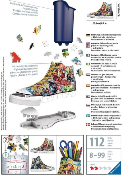 RAVENSBURGER offre une expérience unique avec des baskets 3D que vous pouvez utiliser comme pots à crayons originaux pour stylos, crayons ou même pinceaux. Des pièces spéciales, courbées ou flexibles, qui s’emboîtent parfaitement, permettent de construire une basket design au motif des héros Marvel Avengers, avec un rendu très réaliste. Les pièces sont en plastique solide et garantissent une excellente stabilité sans colle.