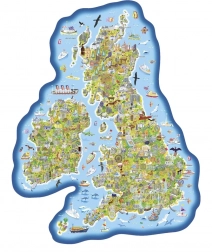 Puzzle en contour Carte de Grande-Bretagne et d’Irlande offrant une vue richement illustrée des animaux typiques, des monuments et des curiosités de chaque région des îles Britanniques. Idéal pour soutenir l’apprentissage et améliorer les connaissances en géographie.