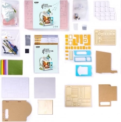 Le kit est livré en pièces détachées et contient tous les outils nécessaires, y compris la colle, les peintures et le pinceau. Le montage s’effectue principalement avec des pièces pré-découpées en contreplaqué, des éléments en carton et en tissu. Pour faciliter l’installation de l’éclairage, nous recommandons d’utiliser une pince ronde, mais de simples ciseaux suffisent également.