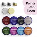 - Contenu du kit : - peinture blanche et jaune vif (2 x 30 ml), 8 peintures pour le visage (8 x 18 ml), 3 gels pailletés (3 x 12 ml), 10 éponges, 3 pinceaux (fin rond, polyvalent, plat), guide illustré (en anglais), boîte lavable.