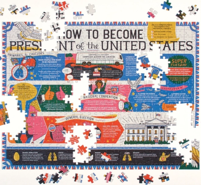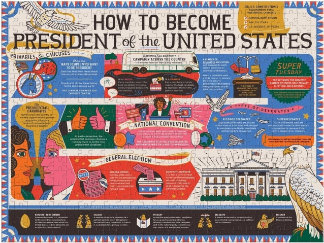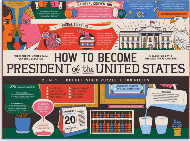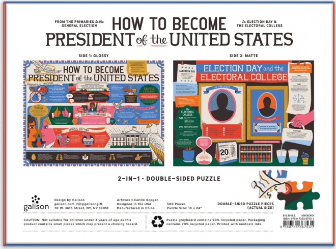 Découvrez un puzzle à la fois ludique et éducatif : un puzzle recto-verso sur le thème du chemin vers la présidence des États-Unis. Profitez de 500 pièces, de deux faces distinctes (brillante et mate) pour un assemblage plus facile et d’un motif clair présentant les étapes des primaires jusqu’à l’élection. Un visuel récapitulatif des deux faces est également inclus.