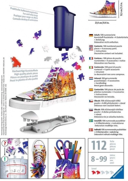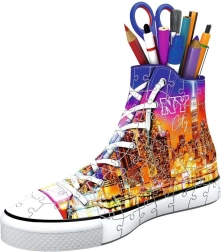 Ce puzzle 3D propose une forme innovante et originale pour tous ceux qui aiment assembler des pièces et les accessoires tendance. Grâce aux pièces spéciales courbées et flexibles qui s’emboîtent avec précision à leur emplacement, vous pouvez construire une basket réaliste au motif New York City – la ville qui ne dort jamais.