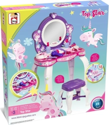 Une coiffeuse élégante pour enfants avec des motifs de licornes, idéale pour toutes les petites coquettes. Elle offre un riche ensemble d’accessoires, un tabouret confortable et une conception sûre pour les enfants dès 3 ans. Grâce à son design ludique, elle stimule la créativité, l’imagination et le jeu de rôle au quotidien.