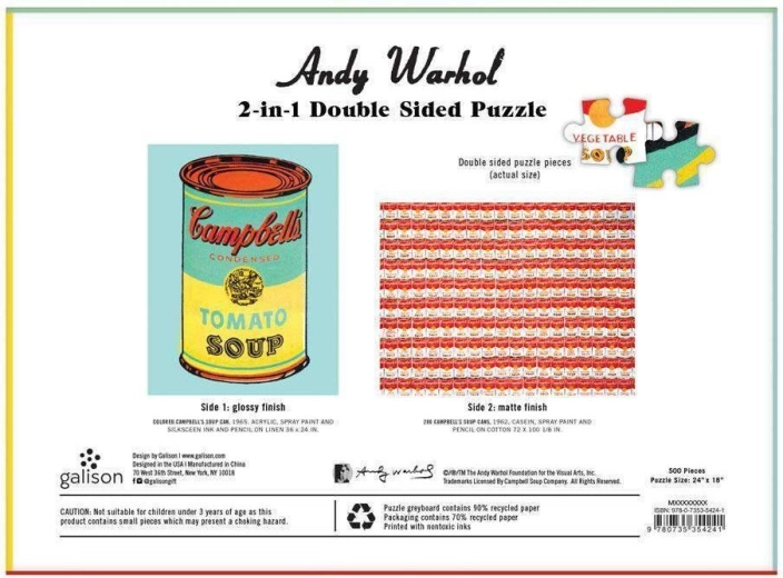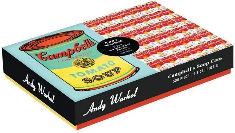 Profitez d’une œuvre pop-art iconique avec ce puzzle recto-verso de 500 pièces. D’un côté, le motif Campbell's Soup de ANDY WARHOL, de l’autre un motif répétitif. Double finition – mat et brillant – pour faciliter le tri et l’assemblage. Idéal comme cadeau pour les amateurs d’art et de puzzles de qualité.