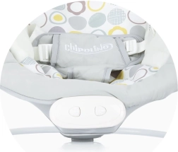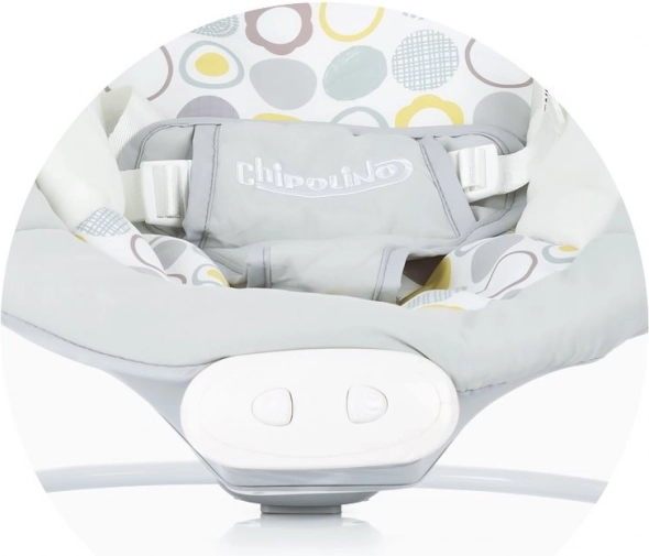 Les boutons de commande permettent de régler les mélodies et les vibrations. Le produit comporte également la marque Chipolino sur le harnais de sécurité.