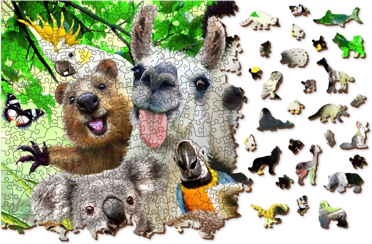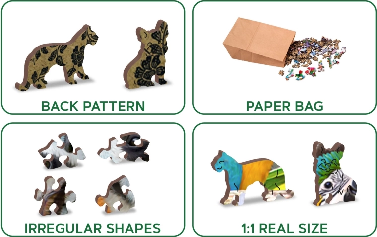 Puzzle en bois Paradis de l'ours 2 en 1 de la marque Wooden City est fabriqué avec un souci écologique, comme le prouve l'absence d'emballages plastiques. Chaque pièce est découpée au laser avec précision, offrant des bords lisses sans échardes. Grâce aux pièces de forme unique représentant des animaux et des bâtiments célèbres, l'assemblage du puzzle devient plus amusant et en même temps plus exigeant. Difficulté accrue associée à l'assemblage sur le côté inversé selon la forme, tandis que le côté face propose des motifs traditionnels de beaux animaux dans leur environnement naturel.