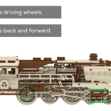 La locomotive utilise un moteur à élastique et des engrenages : une fois remontée, elle roule réellement en avant comme en arrière. Vous verrez les engrenages et les pistons en action.