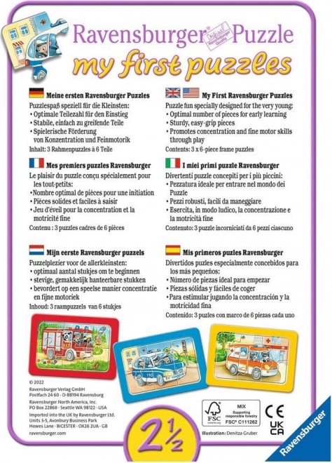 Découvrez la joie des premiers puzzles avec ces puzzles pour enfants RAVENSBURGER. L’ensemble comprend trois images de six pièces chacune, fabriquées en carton extra épais pour les petites mains. Ils développent la motricité fine, la concentration et l’imagination, et séduisent par de mignons véhicules d’intervention conduits par des animaux.