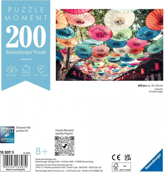 Vous cherchez un court mais intense moment de calme ? Le puzzle RAVENSBURGER Moment au motif de parapluies colorés est l’activité d’évasion idéale au quotidien. Grâce à ses 200 pièces équilibrées et à sa finition de qualité, l’assemblage est fluide, amusant et soulage efficacement le stress de tous les jours.
