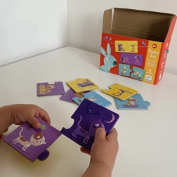 Les puzzles incluent diverses activités interactives et éducatives, comme nommer les animaux, imiter leurs mouvements et sons, ce qui favorise le développement de la motricité globale. Les enfants apprennent également à comparer les images et à trouver les adjectifs correspondants.